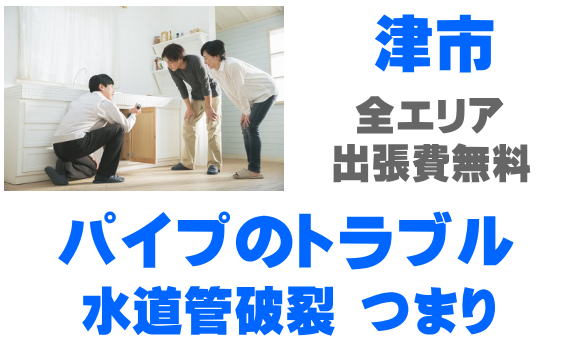 津市でパイプの修理を行っています。水漏れ、つまり、水道管破裂、凍結、漏水などのお困りごとはご相談ください。